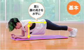 プランクの基本姿勢をとります。腰が落ちたり、お尻が上がったりしないように「肩と腰の高さを水平にする」のがプランクのポイントです。 -