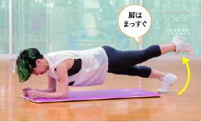慣れてきたらもう少し負荷をかけてみましょう。ひじを伸ばして腕立て伏せの形がハイプランク。重心の位置高くなるので負荷も大きくなります。