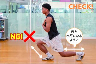 前のひざがつま先より前に出ないように注意しましょう。さらにゆっくり行うと負荷がアップ。