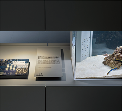 「SCOPE 見えなかった世界を見つめる」をテーマに、水族館と図書館を融合させた展示エリアです。水槽・キャプション・本を一つのユニットにした展示什器が最大の特徴。水槽と本を一緒に見ていくことで、自然や生物について楽しく学べます。