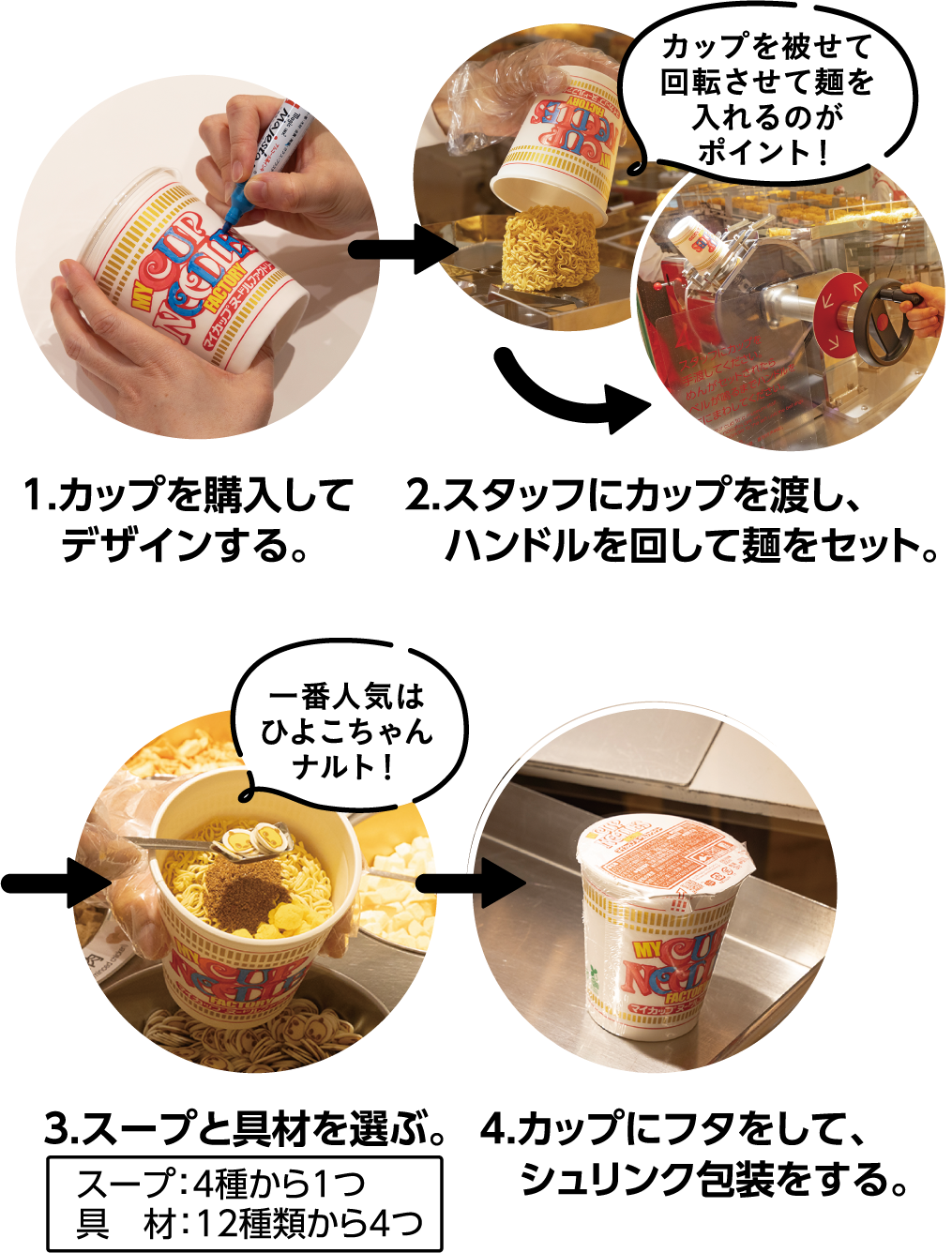 新しいアイデアの生み出し方を視覚的に表現した展示や、自分だけのオリジナルの「カップヌードル」作り体験など、見て、さわって、遊んで、食べて、楽しみながら学べます。