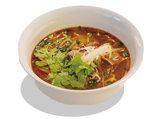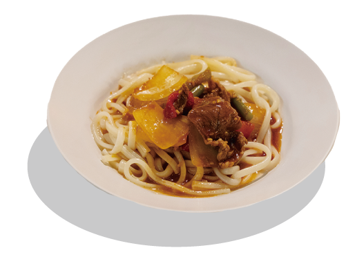 柔らかいうどんのような麺に、羊肉と玉ねぎなどの野菜をトッピング!オイスターソースが隠し味!