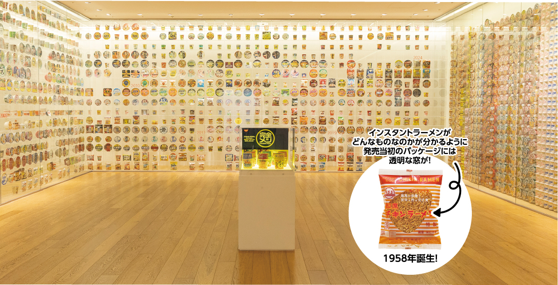 点ものパッケージが壁一面に展示された「インスタントラーメンヒストリーキューブ」では、インスタントラーメンが世界の食文化として広がっていく様子を感じられます。