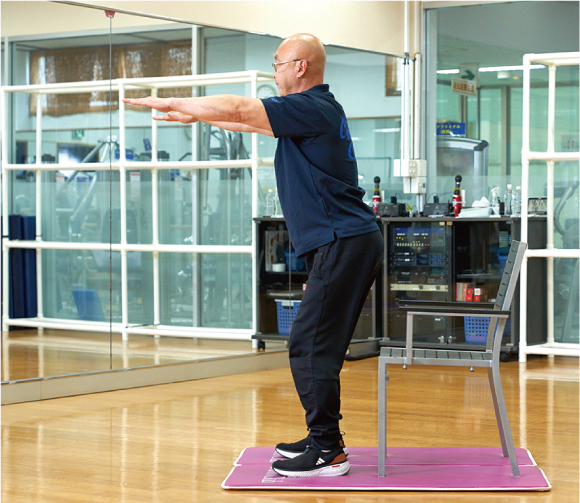 お尻で椅子の座面をタッチして立ち上がる動作を繰り返し、下半身を鍛えます。慣れてきたら10回を15回に、2セットを3セットに増やすと、トレーニング効果が高まります。