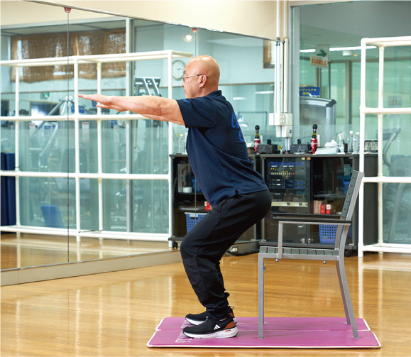 腰を下ろし、お尻が座面に触れたら再度立ち上がり、STEP2~3を繰り返します。