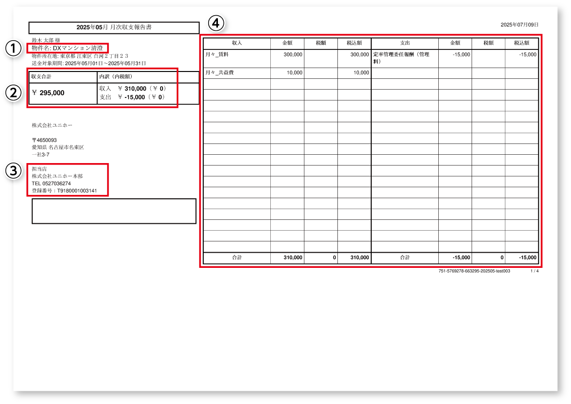 - 大きめの文字で収支合計および収支内訳が記載されており、要点がここで分かります。