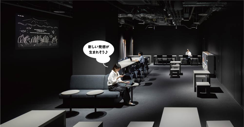 すぐそばに生物たちの気配を感じながら、仕事、勉強、休憩など思い思いの過ごし方ができるオープンスペース。ネットワーク環境やコンセントの整備に加え、本棚やソファも設置。6階の「シロクマベーカリー&」で購入したクロワッサンやコーヒーを楽しむのも醍醐味です。