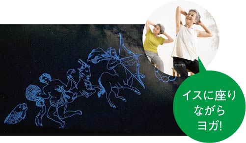 最新のプラネタリウム投影機を使って再現した高精細な星空をイスに座って見ながら、おもに上半身で行うヨガ。美しい星空に癒されながら、腕や背中を伸ばしたり丸めたりと、心地良いポーズで心身ともにほぐしましょう♪