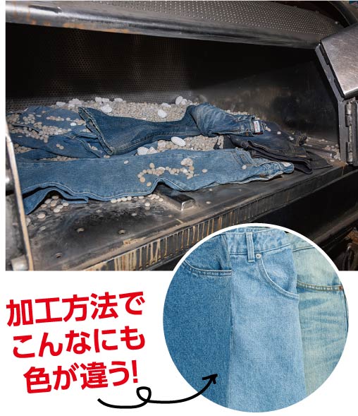 デニム生地の表面を削り、中古感を出すために「軽石」が使われています。「ストーンウォッシュ」と呼ばれるこの加工には、鹿児島県のシラス台地で採れた軽石や、人工の軽石、ゴムボールなどが使用されています。