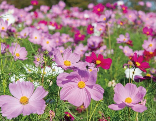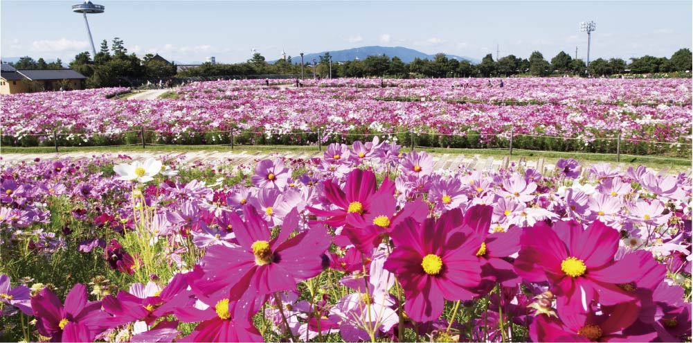 特に見どころなのは、約43,000㎡(13,000坪)の「花ひろば」。9月下旬~11月中旬には、約150万本の可憐なコスモスが赤・白・ピンクとカラフルに咲き誇ります。