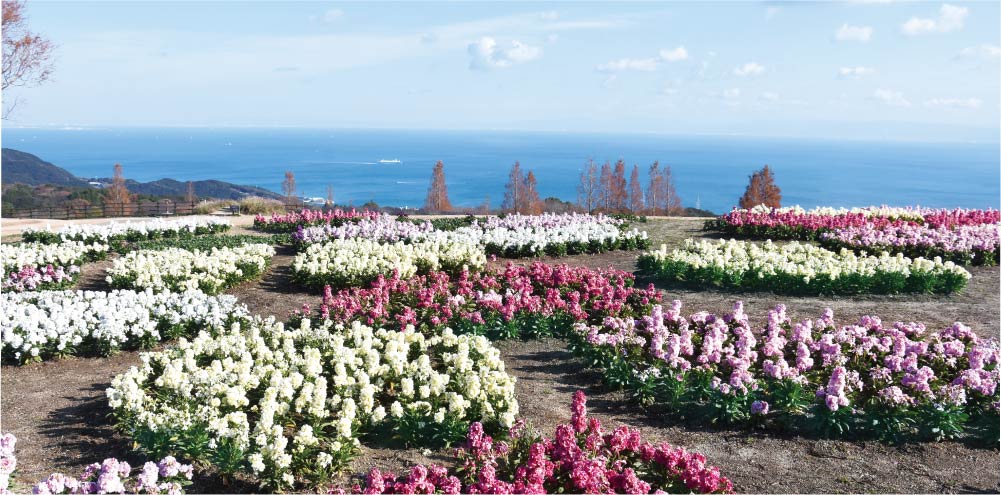 淡路島は、温暖な気候を活かしたストックの一大産地。真冬の澄んだ空気の中、見頃を迎えるストックが、赤、白、ピンクと色とりどりに咲き誇る光景は、冬のあわじ花さじきを代表する風物詩です。