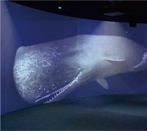 映像を通じて、北海道の世界自然遺産・知床に生息するシャチとマッコウクジラに出会えます。特筆すべき点は実物大の大きさで現れること。大型スクリーンの利点を活かし、2種の生物がダイナミックに泳ぐ様子は圧巻。壮大な海のスケールを感じてみてください。
