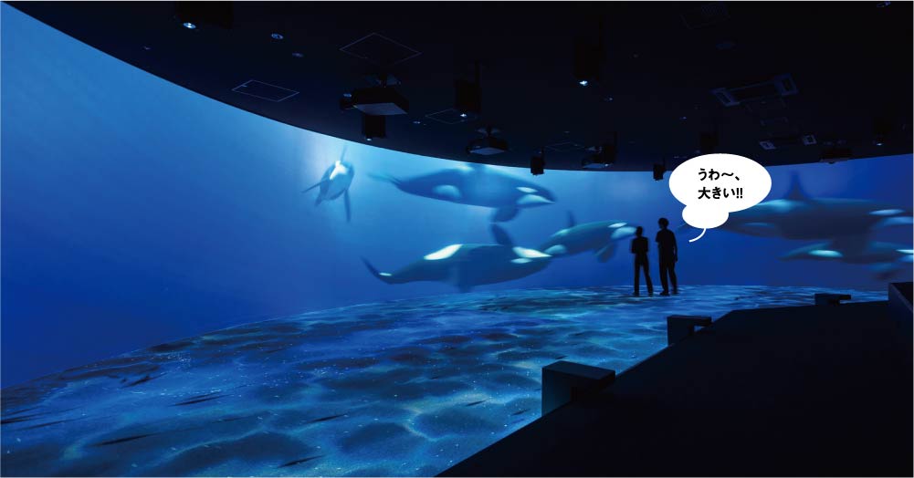 実物大のシャチやマッコウクジラが自由に泳ぐ姿を見ることができ、まるで海の中にいるかのような没入感を満喫できるのがポイントです!