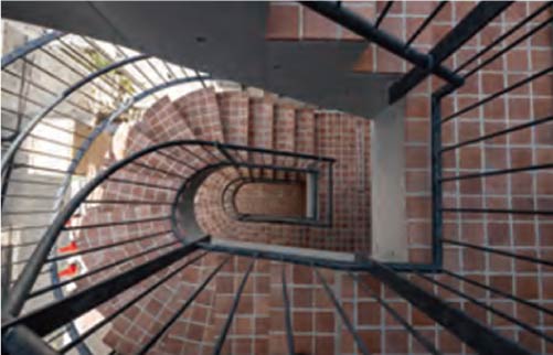 直線の四角い建物部分と曲線の階段部分を対比的に組み合わせ、互いが独立して見えるようにしたのがポイントです。