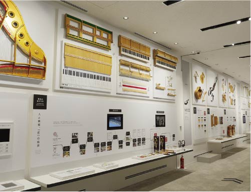 入口からすぐ始まる「ものづくりウォーク」は、壁沿いに様々な楽器のパーツが工程順に並べられており、どのようなプロセスで製作されているのかが理解できます。整調前後の鍵盤の動作の違いや、整音前後の音を比べるなど、クラフトマンシップを感じられる体験もいっぱい。