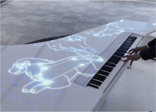 入口正面の「コンセプトステージ」には、押した鍵盤に連動して筐体に星座の映像が浮かび上がるユニークなピアノを配置。プロジェクションマッ ピングによる映像技術との融合に、楽器の未来を感じさせられる一台です!