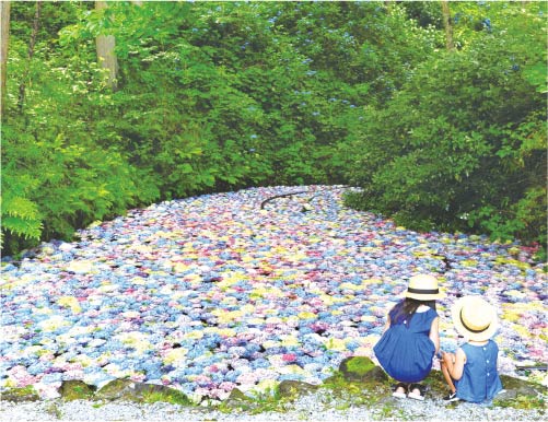 カラフルなアジサイが水面を彩る様子が「映える」と、SNSでも取り上げられています。