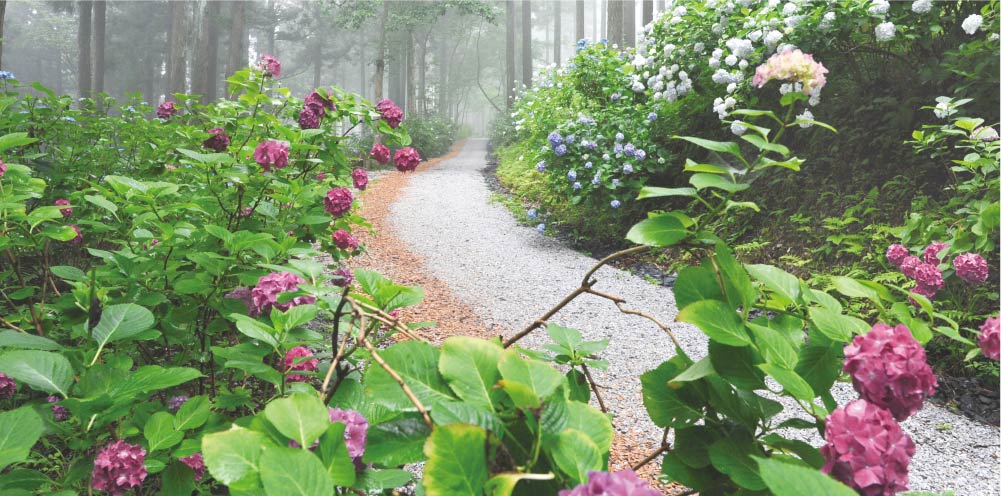 広大な山の中をゆったりと時間をかけて散策し、都会では味わえない静けさと、森林浴を楽しみながらアジサイを眺められます。