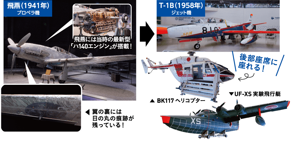 世界で唯一、完全な形で現存する大戦中の戦闘機「飛燕」と、戦後初の国産ジェット機「T-1B」からは、技術の進化が機体をどう変えたのかを間近で体感できます。用途に応じた多様な機体の展示からは、航空機の幅広さを感じられます。