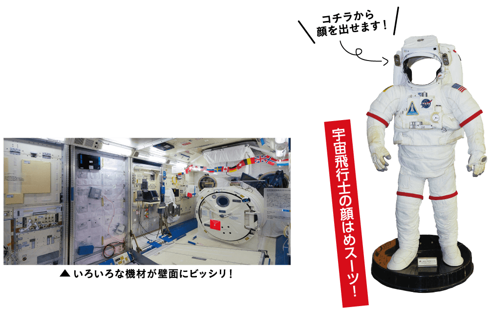 宇宙エリアには、国際宇宙ステーション(ISS)にある日本実験棟「きぼう」の実物大模型が展示されています。宇宙飛行士が活動する船内の細かな部分まで再現されています!