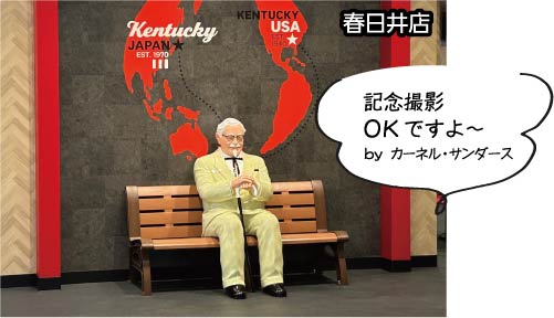 また、KFCのカーネル・サンダースが座ってお迎えしてくれるので、もしお時間がある時は一緒に写真を撮ってみてはいかがでしょうか。