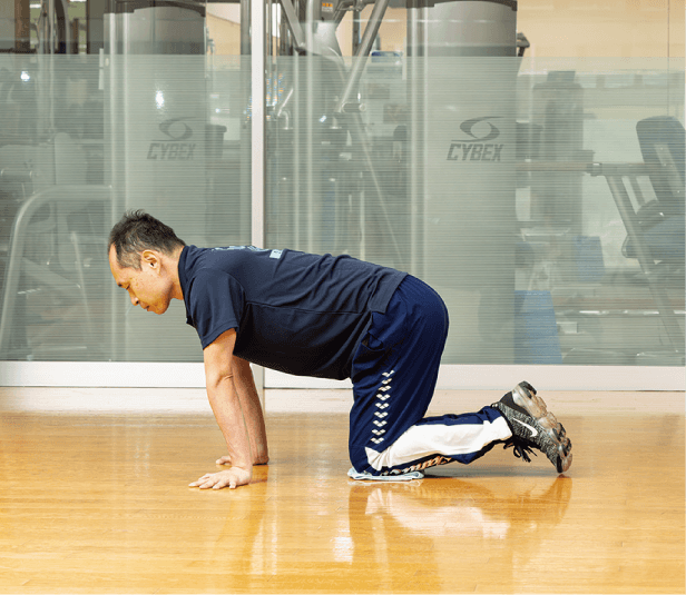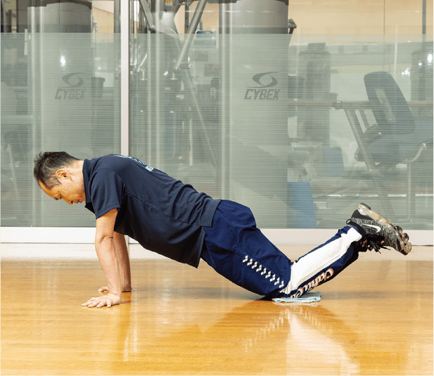 タオルに足を乗せ、腕立て伏せを始める姿勢をとります。手は肩の真下につきます。 -