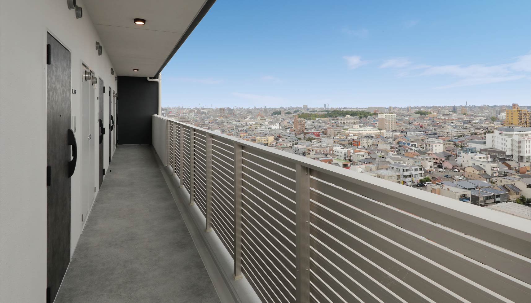 居室に関しては最大2.65mの天井高で、室内を広く感じられるように設計。国道1号線側のバルコニーも横幅1.5mと広く、1階の場合は歩行者の動線を考慮して1m程上げ、目隠しも設置して目線が合わないように配慮しました。高層階のバルコニーからは、名古屋駅や都心部も見渡せます。