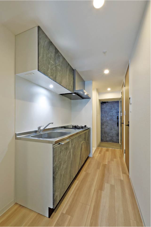 昨年10月に竣工したパルティール笠寺は、鉄筋コンクリート造15階建・全120邸(1K)、単身者向けの新築賃貸マンションで、室内の広さは27m2と広く、キッチンも横幅1.8mと広く設計。収納に関してもウォークインクローゼットと物入れがあり、大容量収納スペースを確保しています。また、浴室のユニットバスは、追い焚き機能・浴室乾燥機付。さらに、無料Wi-Fiも完備しています。