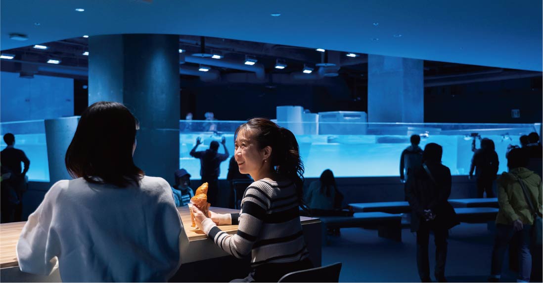 館内は全フロア飲食可能で、お気に入りの水槽を眺めながら美味しいパンやバルメニューなどを満喫できるのが「シロクマベーカリー&」。