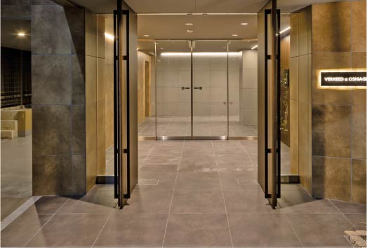 施主様の会社では近年採用されていなかった明るい色彩の外壁をモダンなコントラストとして取り入れ、自然な素材感のある色合いのエントランスをコンセプトに設計されました。