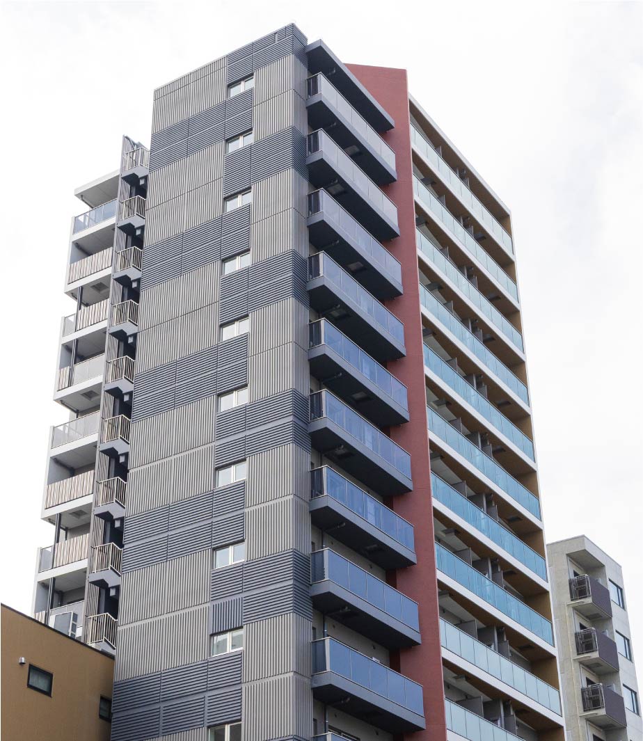 川本:特に力を入れたのが、東面の外壁に採用した「リブ状デザイン」です。1階から14階まで縦横に規則的な凹凸が施されているのですが、これは施工図だけで完全に表現できるものではありませんでした。型枠を外したときにどう見えるか、職人さんと共に完成形を想像し、「目地の位置はここで良いか」「金物はどうするか」と現場で緻密な調整を重ねました。実際にやって上手くいかないときは施工方法を変え、徐々に形にしていったのです。